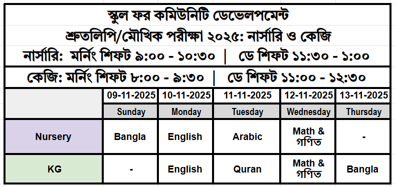 নার্সারি ও কেজি শ্রেণির মৌখিক/শ্রুতলিপি পরীক্ষার সিডিউল